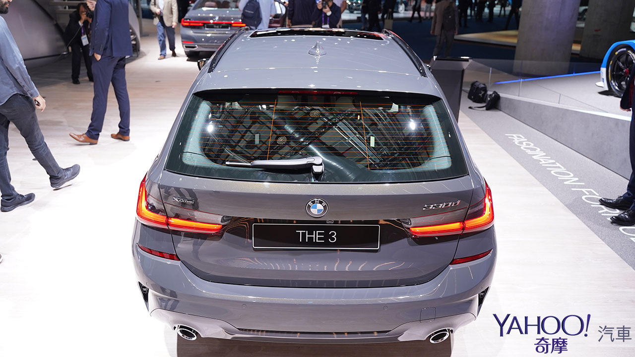 來到車尾,雖然在車展中展出的為330d車型,不過在尾燈設計也同步Sedan車型,採用LED尾燈組設計,而在燈組上方的肌肉線條也額外強化,結合後保桿左右二側的類進氣設計以及大口徑雙出排氣管,運動感完美呼應車頭與車側的設計邏輯,彰顯巴伐利亞對於設計上的細膩處理。
