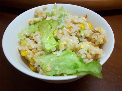 6.放入燙好切碎的鮭魚,拌炒後再加入玉米粒