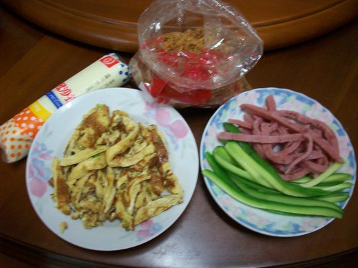 4. 小黃瓜2條,蛋約3~4個,長條型火腿1條肉鬆(或魚鬆)少許