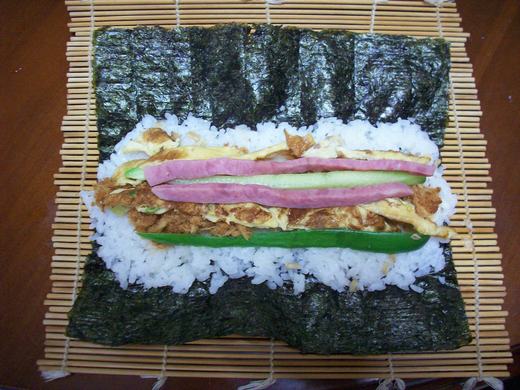 通常是把米飯鋪上薄薄的一層後,放材料前,順材料方向來回擠一~二道,再放上肉鬆等其他材料.