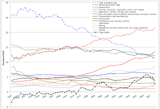 問題是美國的製造業所佔 GDP 比例在持續下降,由金融業和專業服務業所取代。而製造業所佔比例的下降造成勞工的失業,也造成底層消費人口消費能力的萎縮。這對經濟的穩定性很不利!
