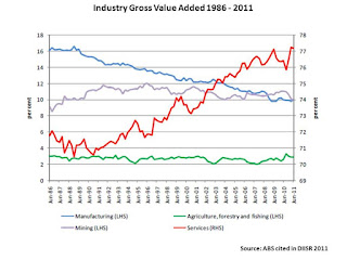 在這過程中,日本與亞洲四小龍這些仰賴國外市場與製造業的國家被迫在歐美先進國的專利優勢和新興國家的成本優勢下陷入成長空間萎縮的困境。日本大部分製造業停留在「中價位、中上品質,優越品管」的形象下,沒有成功地建立「高價品牌形象」(從汽車、半導體設備,到時髦產業),此外新興科技也很難爭食歐美全力鞏固的專利版圖。因此,日本雖然鞏固了許多關鍵零組件的全球壟斷性地位,但是失去的產業機會遠多於新劫獲的產業機會,製造業佔 GDP 的比例逐年降低而由較難出口的服務業取代(服務業的出口主要是金融、時尚產業與高科技產業的智財授權,這些項目並非日本所長),以致於過去二十年來的平均 GDP 成長率低於1%,號稱失落的二十年。