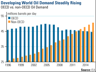 目前推升油價、糧價與各種物價的主要力量有三個:全球各國的量化寬鬆刺激通貨膨脹,全球能源需求持續成長以致高價石油佔全球供應量的百分比持續升高而推高油價,而氣候極端化則造成農作物減產。這些趨勢看起來只會惡化,我看不到改善的機會。雖然國外有許多經濟學的論文主張歐美國家的 GDP 成長愈來愈不倚賴石油(右上圖),但是新興國家對石油的需求量卻急速暴漲(左上圖與左圖)。