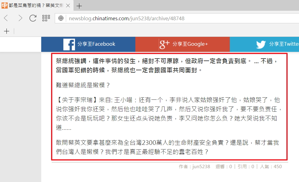 jun5238於http://newsblog.chinatimes.com/jun5238/archive/48748以李宗瑞迷姦犯罪談蔡英文,如下: