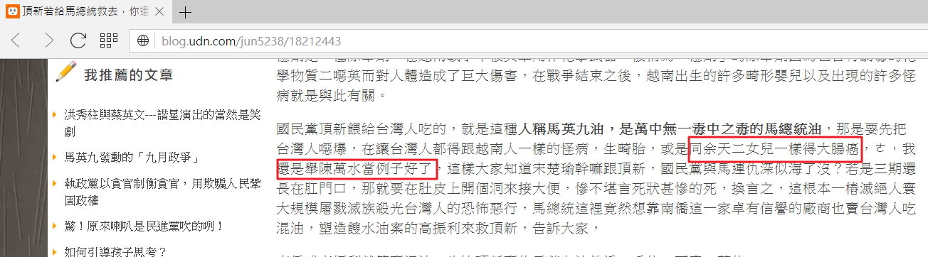 …國民黨頂新餵給台灣人吃的,就是這種人稱馬英九油,是萬中無一毒中之毒的馬總統油,那是要先把台灣人噁爆,在讓台灣人都得跟越南人一樣的怪病,生畸胎,或是同余天二女兒一樣得大腸癌,ㄜ,我還是舉陳萬水當例子好了,這樣大家知道宋楚瑜幹嘛跟頂新,國民黨與馬連仇深似海了沒?若是三期還長在肛門口,那就要在肚皮上開個洞來接大便,慘不堪言死狀甚慘的死,換言之,這根本一樁滅絕人寰大規模屠戮滅族殺光台灣人的恐怖惡行,馬總統這裡竟然想靠南僑這一家卓有信譽的廠商也賣台灣人吃混油,塑造餿水油案的高振利來救頂新,告訴大家,…
