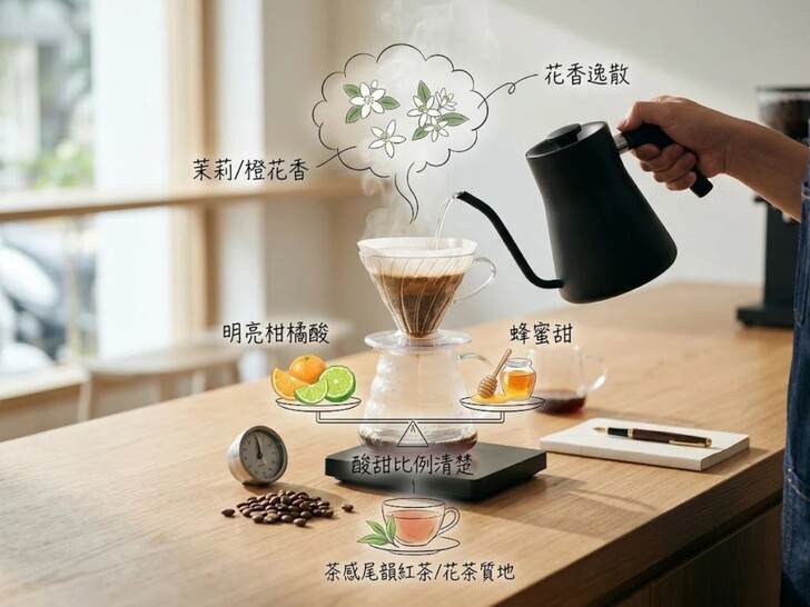 這款走的是「花香+甜感+茶感」路線。茉莉與白花香氣清楚,搭配柑橘與萊姆酸質,中段有紅糖與蜜蘋果甜感,尾韻帶茶香。整體結構細緻且乾淨,很適合喜歡清爽型咖啡的人,也是在手沖咖啡豆推薦中很常見的藝伎方向。