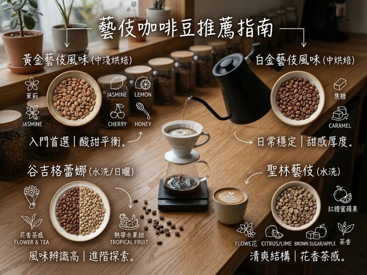 如果你想從咖啡豆推薦中挑選藝伎咖啡,其實可以直接從前面提過、風味表現清楚且容易辨識的幾款入手。藝伎咖啡本身就以花香、甜感與細緻酸質聞名 ,因此只要選對方向,很容易就能喝出它的特色。