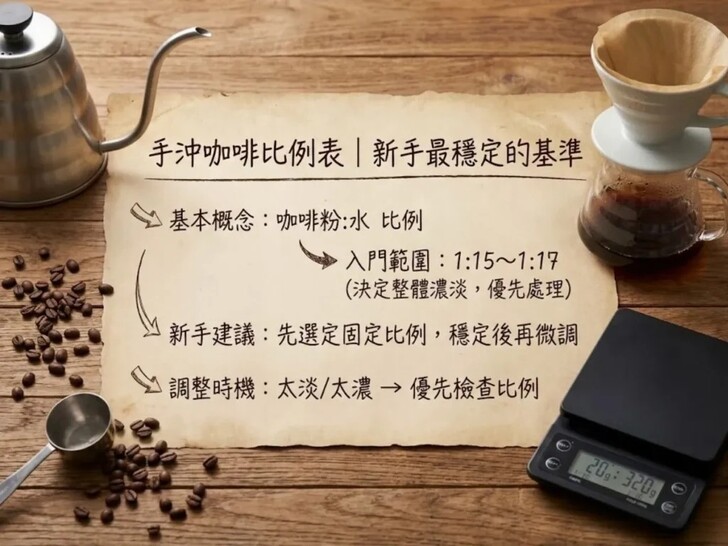 對剛開始學手沖咖啡的人來說,使用手沖咖啡比例表時,建議先選定一個中間值,例如 1:16,並連續多次使用相同設定進行沖煮。當你能穩定沖出相近味道後,再依個人口味微調比例,例如想喝濃一點可調到 1:15,想清爽一點則可拉到 1:17。這樣的使用方式,能避免新手在比例、研磨、注水同時變動,導致無法判斷味道改變的真正原因。