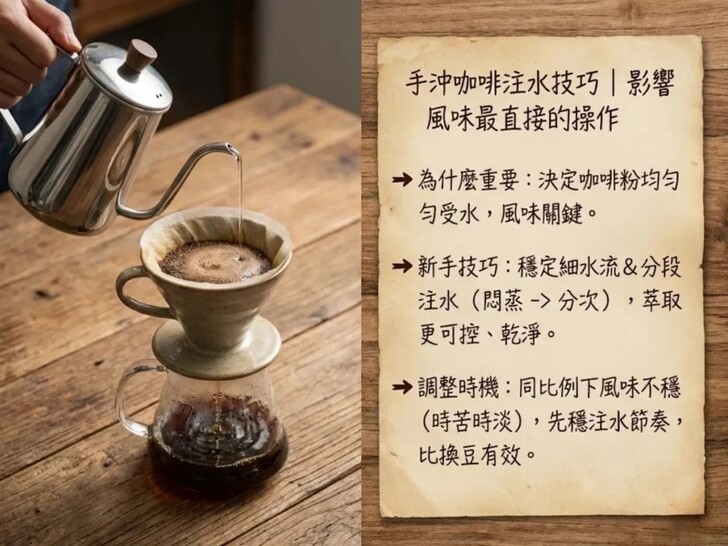 對大多數新手來說,分段注水是最安全的方式。它能讓萃取節奏更可控,也比較不容易過度萃取,是手沖咖啡入門教學中最常建議的注水方法。