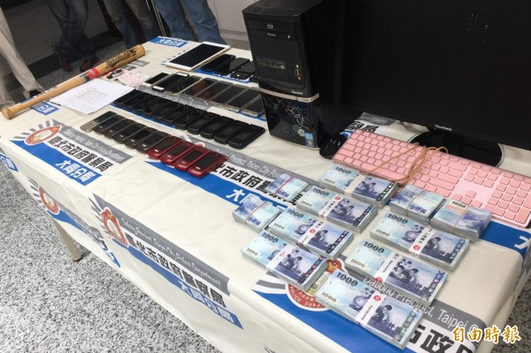警方起出贓款97萬餘元、空白支票1本、手機32支、球棒1支、電腦2組、少量大麻毒品及黃嫌白色賓士座車等贓證物。(記者陳恩惠攝)