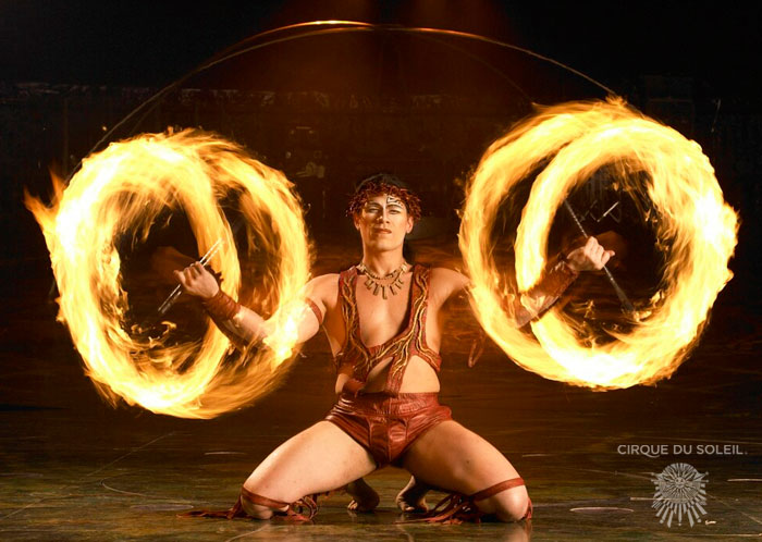 這是已快到中場前的高潮橋段!隨著舞台燈光熄滅,雜技藝人,將由一開始耍弄一支火棍,接著再同時耍弄2枝。出神入化的技藝,火焰的光影伴隨著緊湊的音樂,觀眾也開始亢奮!