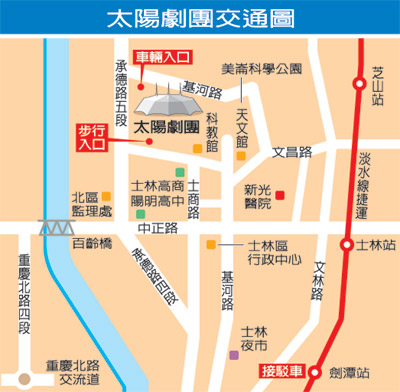 另外,關於已購票的朋友,太陽戲迷也有重要交通訊息公佈。聯合報2009/1/13訊:主辦單位聯合報系為了讓觀眾方便前往觀賞,特別在劍潭捷運站準備接駁巴士,專車以太陽劇團的劇照裝扮,太陽劇團「Alegria歡躍之旅」捷運接駁巴士,由大都會客運協助,從一月十四日首演場開始到二月廿二日,每天下午六點十分到七點十分在劍潭捷運站一號出口左側,以連續接送的方式,接駁觀眾直接前往表演場地。