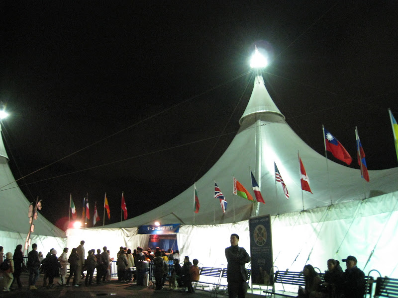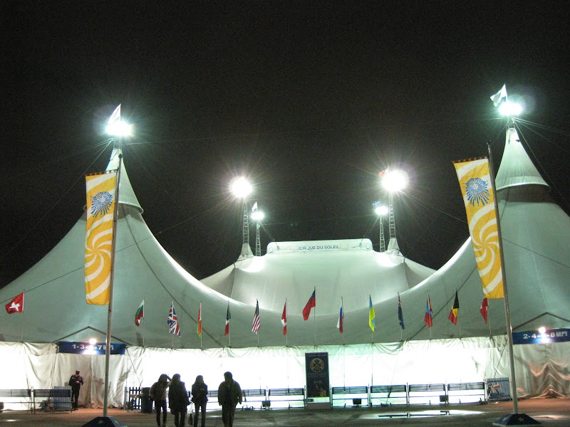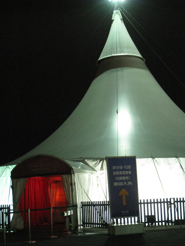大帳篷(此張拍攝於散場後)。大帳篷各國國旗林立,太陽劇團Cirque Du Soleil的旗幟也在場內飄揚。入場其實很簡單,入口就是照片中的2個門。票根上奇數號碼(1.3.5.7)於左邊入口進場,偶數號碼(2.4.6.8)於右邊入口進場。現場皆有工作人員親切導引入場。
