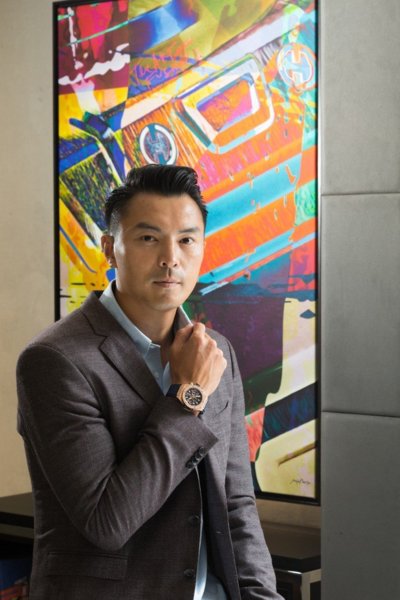 以西裝造型演繹Big Bang Meca-10皇金藍腕表,陳信安展現出斯文帥氣魅力。