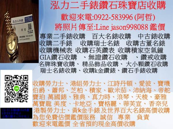 全省高價收購專線:0922583996 阿哲 泓力二手錶鑽石珠寶收購