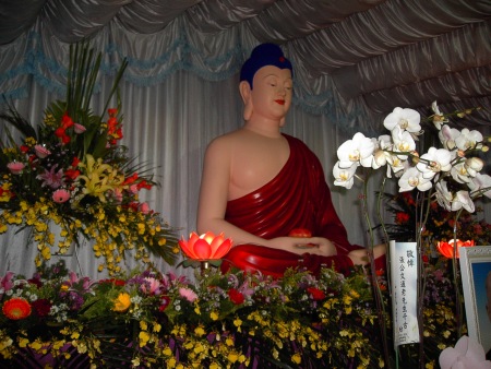 二、靈堂佇亭仔跤,因為厝比路面懸真濟,亭仔跤到大路有一個崎度,外口搭一格布帆,彼個趨嶇仔煞無平,未通排椅桌,空間變獈,蓮友欲來誦經,攏特工吩咐:「人毋通超過二十人」。天氣熱,人坐甲滿滿窒淀,汗流汁滴,對蓮友真歹勢、真失禮。毋閣,奠禮的時助念團蓮友來四十六個人,家奠進前,怹就來念半點鐘佛號,閣參加到完滿,送靈車出去,心內真感激。
