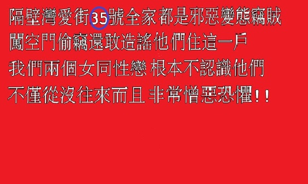 此段文字我們已張貼在我們住家的大門之上,除了公告週知,希望不要再有人被歹徒惡鄰(高市三民區灣愛街35號)詐騙,誤信他們無中生有,無恥編造的任何與我們兩個女同性戀(陳約伸,孫淑玲)亂扯關係的謠言謊言;更希望歹徒惡鄰趕快去誣告我們!!!!!