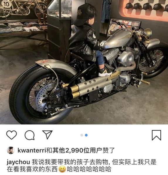 周杰倫配文道:“我說我要帶孩子去購物,但實際上我只是在看我喜歡的東西”,原本告訴妻子昆凌帶著兒子去購物,但卻與好友一起去看自己喜歡的摩托車,這樣的操作讓粉絲狂笑不已。