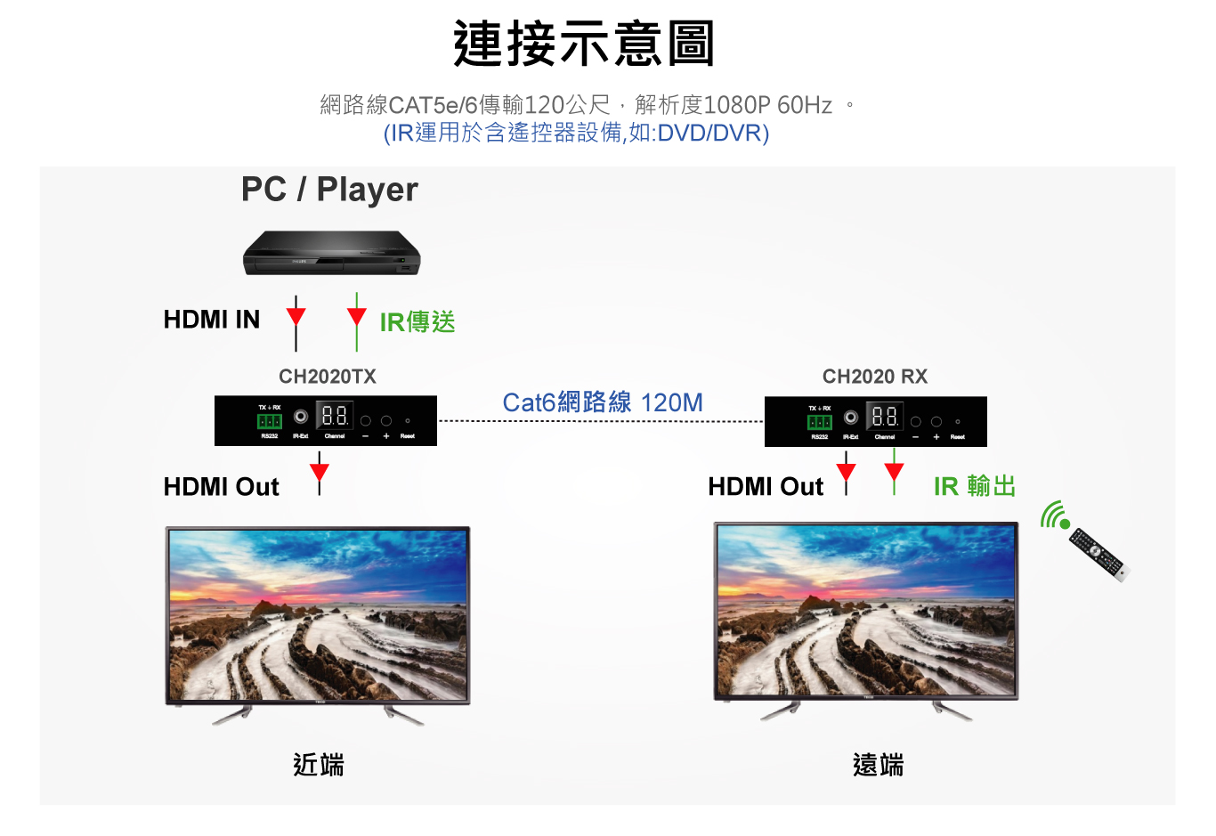 [ CH2020 ] HDMI 訊號透過網路線 或 IP傳輸訊號,距離最遠可達120公尺, 解析度達 1080P 60Hz; 畫質超越一般壓縮式延長器, 清晰無鬼影現象。