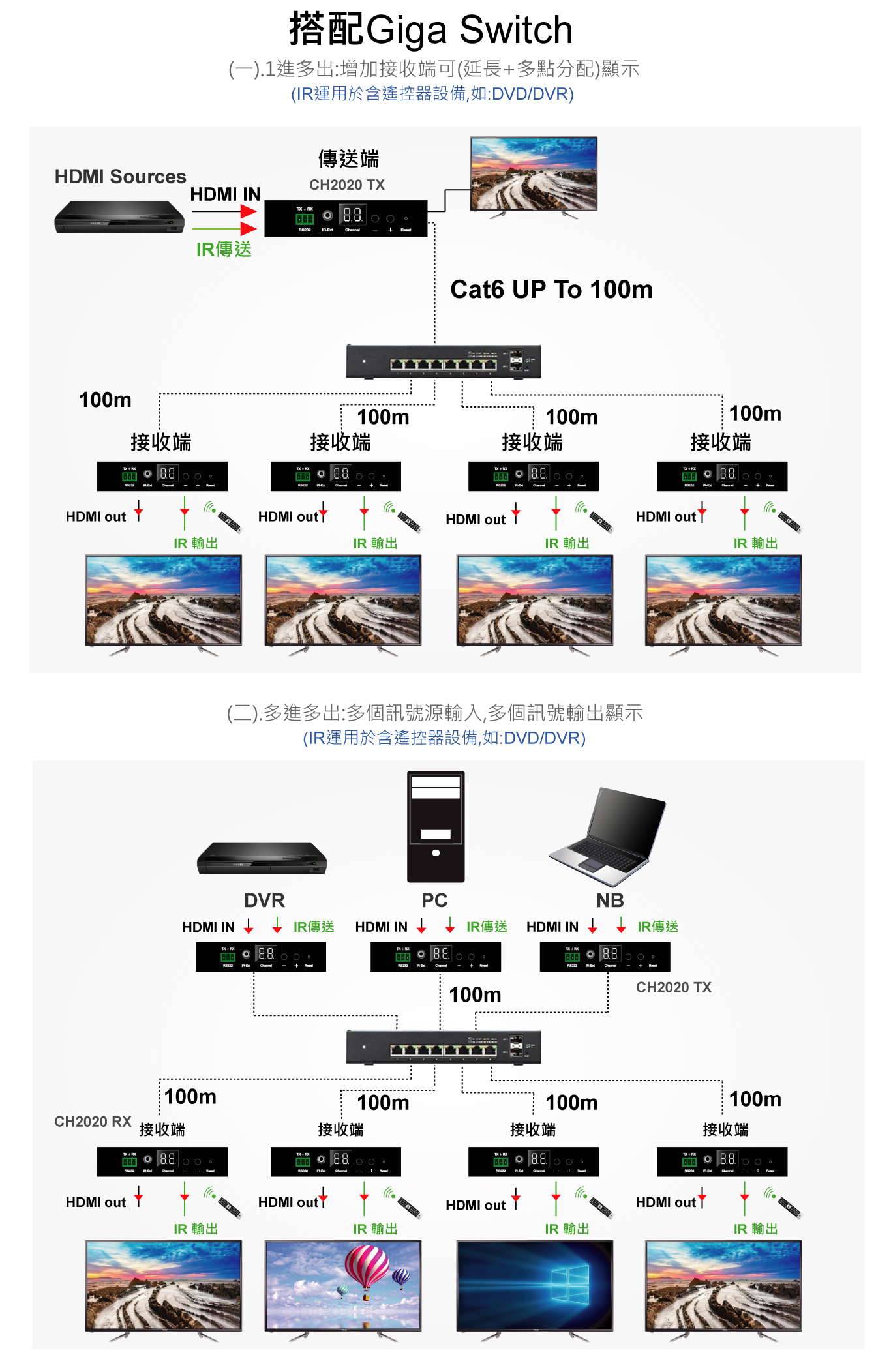 可連接 IGMP Giga Switch達到 1進多出同步顯示, 多進1出切換顯示, 多進多出矩陣交叉顯示功能, 可串級延伸距離, 每級可達120公尺距離.