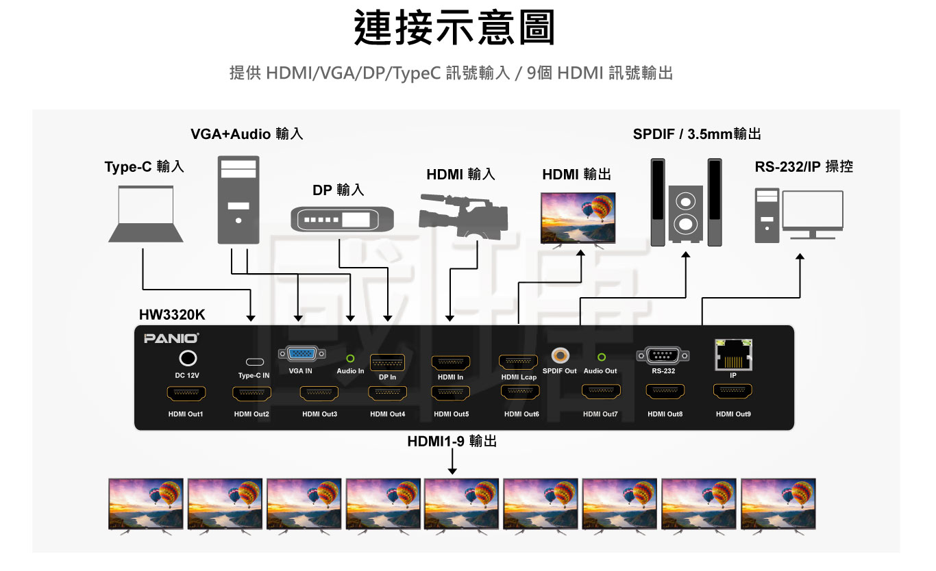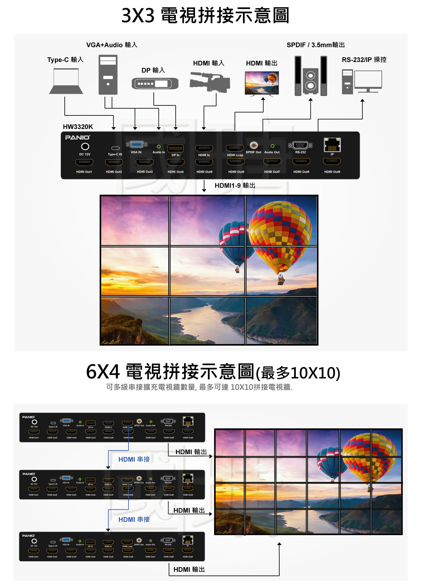 國瑭3 X 3電視牆拼接處理器(型號:HW3320K),內建 1x2 1x3 1x4 2x2 2x3 2x4 3x1 3x2 3x3 4x1 4x2,可多級串接擴充電視牆數量, 最多可達 10X10拼接電視牆.