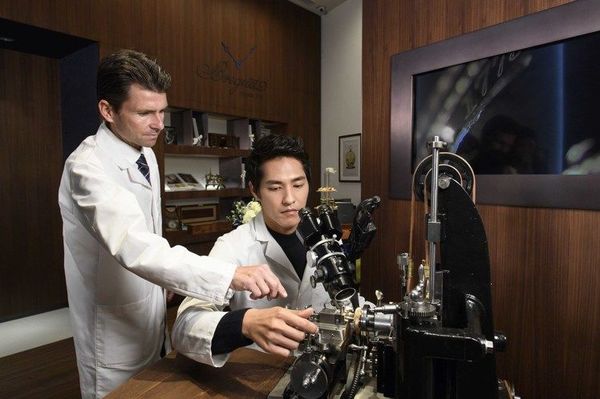 金鐘視帝藍正龍在Guillaume Braud先生的指導下,體驗骨董機刻雕花機的操作。