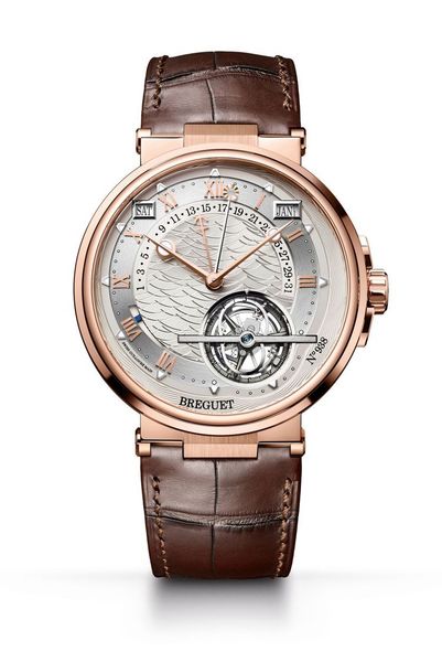 藍正龍配戴寶璣航海系列Marine 5887時間等式萬年曆陀飛輪腕表,18K金表殼、表盤中央機刻雕花波浪飾紋,約693萬6,000元。