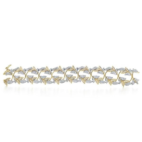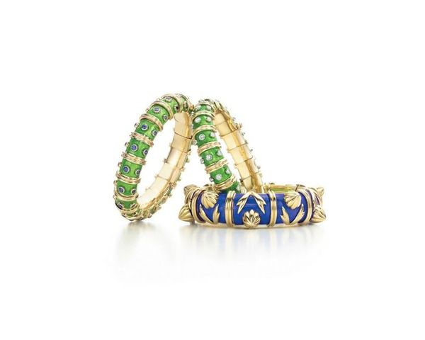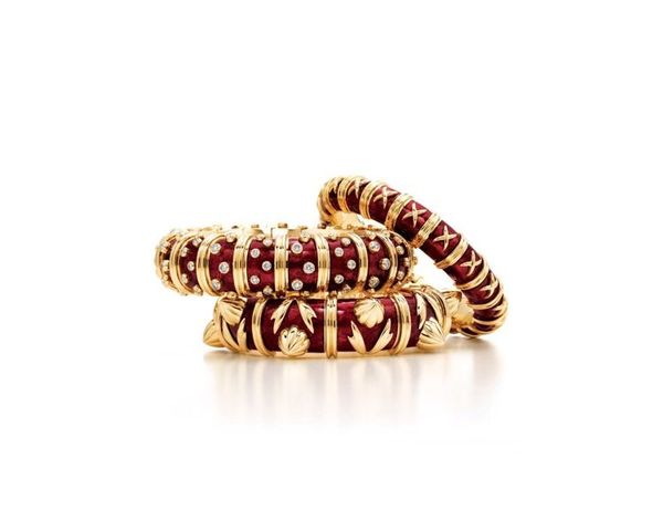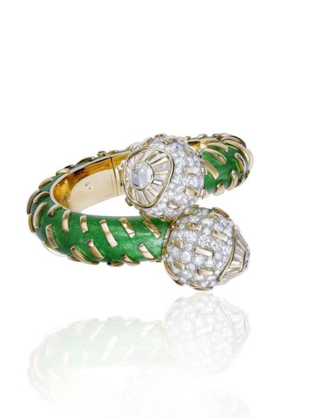 Schlumberger仙人掌花朵琺瑯手鐲,是首度公開的手稿作品,18K黃金、鉑金和Paillonné金箔琺瑯,鑲嵌玫瑰式切割、矩形切割和圓形明亮式切割鑽石,1,180萬元。圖/Tiffany & Co.提供