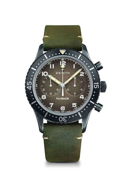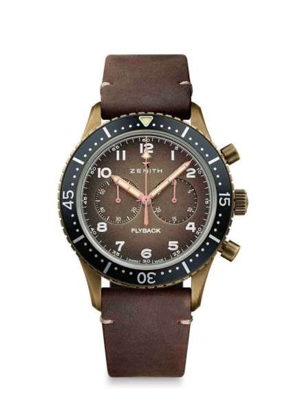 在50年前,Zenith曾推出一只被暱稱為「Cairelli」的Pilot Cronometro Tipo CP-2計時碼表,當時是受義大利軍方委託製作,由於數量稀少加上性能優異,是軍事迷和藏家們心中的夢幻逸品。今年品牌延續了這只傳奇腕表的概念與外型,搭載El Primero導柱輪機芯,使其具備飛返計時功能,搭配青銅或復古精鋼表殼。表盤上帶有琢面箭頭形指標和阿拉伯數字,招牌的TIPO CP-2表盤在9點、3點鐘位置分別設計著小秒針和分鐘計時盤,同時搭配棕色或綠色油性磨砂皮表帶。