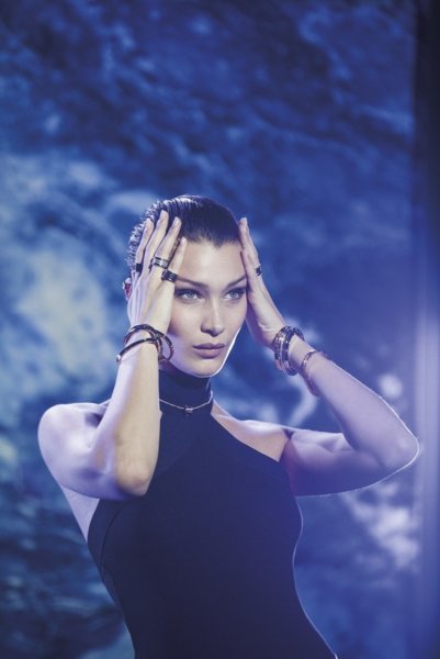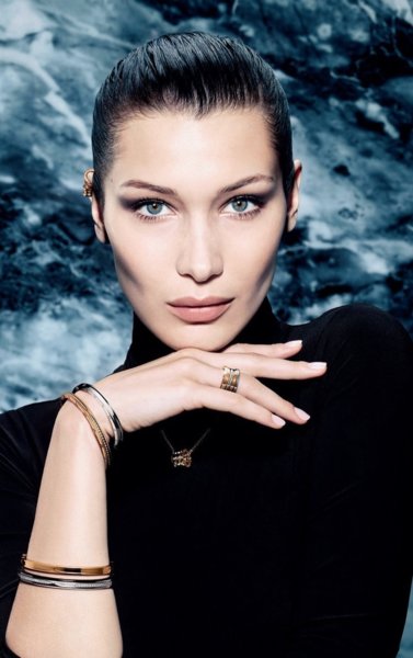 時尚潮模暨寶格麗配件代言人Bella Hadid配戴B.zero1 Labyrinth迷宮系列。圖/BVLGARI提供