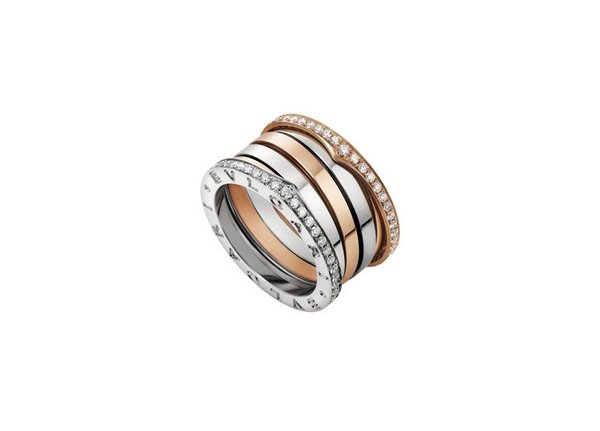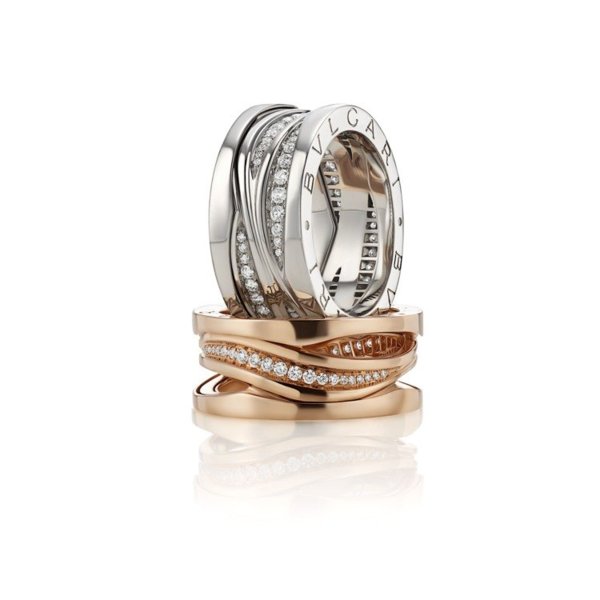 BVLGARI B.zero1 Design Legend設計傳奇系列,玫瑰金三環戒指鑲鑽款,12萬6,400元;白K金三環戒指鑲鑽款13萬4,000元。圖/BVLGARI提供