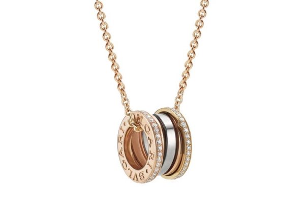 B.zero1 Labyrinth 迷宮系列白K金與玫瑰金雙色金鍊墜搭配玫瑰金項鍊鑲鑽款,18萬4,900元。圖/BVLGARI提供