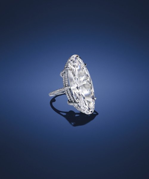珠寶藝術家JAR的一枚名為「Thread」的22.76克拉馬眼型切割D級VVS1、TYPE IIA美鑽鑽戒,估價在7,330萬元以上。圖/佳士得提供