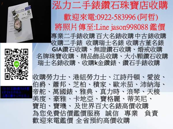全省高價收購專線:0922583996 阿哲 泓力二手錶鑽石珠寶收購