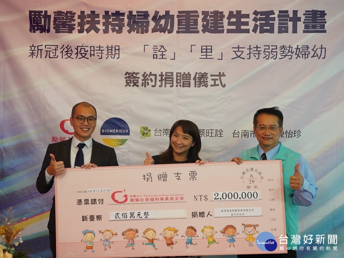 長期關懷勵馨之臺南市蔡旺詮議員出席簽約捐贈儀式表示,期待此次活動可以邀請社會大眾拋磚引玉,正視疫情所帶來的經濟衝擊,特別在疫情期間與香港商生物梅里埃公司台灣分公司區域銷售經理李耕溥,一起支持弱勢婦幼的生活重建計劃,並捐助新台幣200萬元扶持弱勢婦幼、青年帶來一絲曙光。