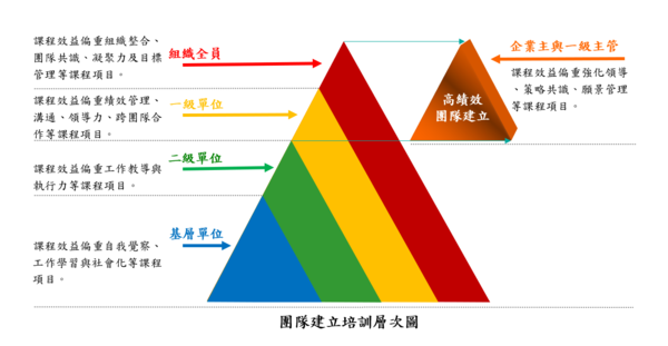 其執行設計依據組織任務、策略目標、成員結構、發展階段不同面向的部分或全面調整下,實施階段性與長期性強化團隊效能之連續性課程。