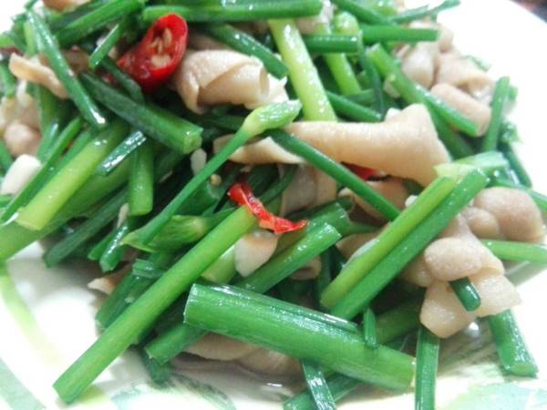 非菜花炒鵝(鴨)腸,把韭菜花與腸子的彈性發揮到極致,而且又能相互契合,而韭菜花強烈的味道雖在大火熱炒時散去不少,但仍保有獨的剛口感與香氣,配著白飯吃,超下飯的。