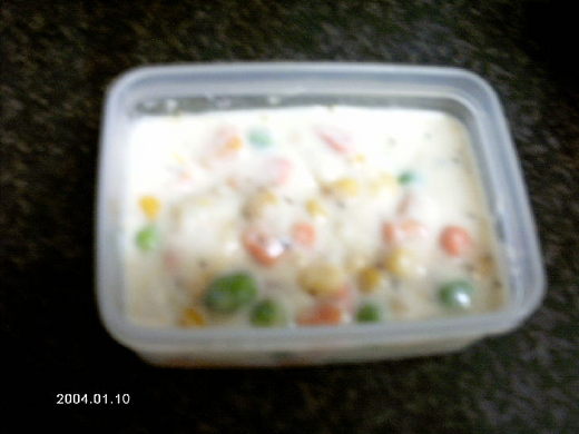 因為奶油與麵粉會形成沉墊,於是加入牛奶後,用攪拌器充份扮勻之,加胡椒細粒/意大利香料與鹽後,再置入微波爐四分鐘後,拿出再加以拌勻,此動作非常重要.