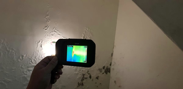 使用紅外線熱像儀來檢測,可以看出拍攝地方的不同溫度區塊是否符合漏水形狀,抓漏師傅需有相當的經驗即可從中找出可能的水漏主要區域。