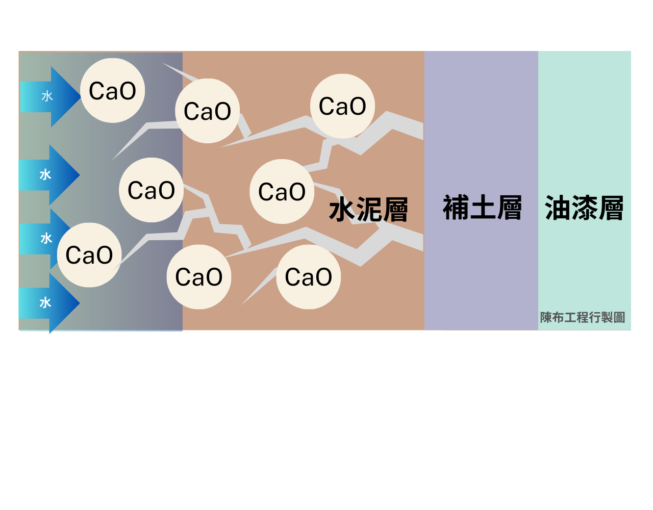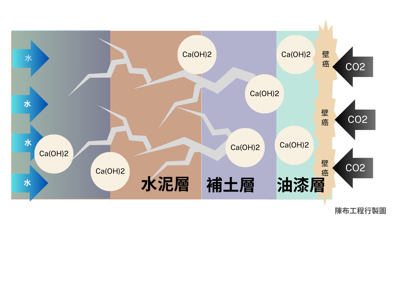 首先,先來了解壁癌是如何產生的,現在進入化學課程囉!由下圖可清楚看到一面牆的結構,水泥裡面主要為鈣成份組成,當牆壁的防水層失效,水份進入水泥牆內,開始產生化學反應,形成溶於水的氫氧化鈣(Ca(OH)2),化學寫法:氧化鈣CaO+水H2O=氫氧化鈣Ca(OH)2。