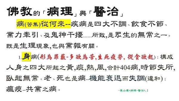 佛教的「病理」與「醫治」(象山慶25.10.23) 《佛說八大人覺經》:為佛弟子,常於晝夜,至心誦念,八大人覺。 病(苦集)從何來 疾病是四大(地、水、火、風)不調、飲食不節、業力牽引、及鬼神干擾……...