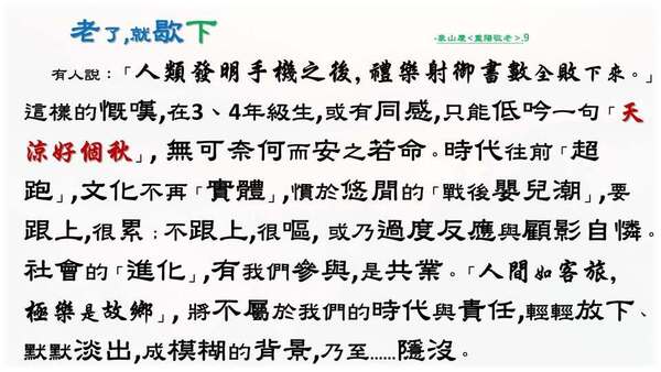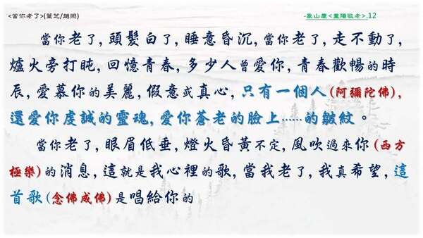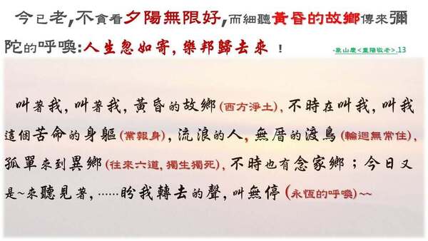 這段話對老年人且勸且教,有捨有取,導向「看破世間,一心念佛」,以此為暮景晚年之最實在、最智慧的身體活動及心念歸趨。淨空法師[17]云:老年人退休了,兒女也獨立了,可把全部的時間、精神來學佛。要向他們講解六道輪迴、諸佛剎土,介紹西方極樂世界,阿彌陀佛的因地修學、果地成就,及諸佛的讚歎,往生的殊勝,讓他們滿有希望與活力,進而看破世間,放下一切,(念佛成佛)得大自在。