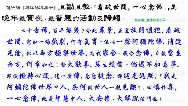 七十古稀,百年能幾?今此暮景,正宜放開懷抱,看破世間,宛如一場戲劇,何有真實?但以一聲阿彌陀佛,消遣光陰,但以西方極樂世界,為我家舍。我今念佛,日後當生西方,何幸如之!發大歡喜,莫生煩惱。倘遇不如意事,即便撥轉心頭,這一聲佛,急急提念,迴光返照,「我是阿彌陀佛世界中人,奈何與世人一般見識?」回嗔作喜,一心念佛。 此是智慧中人,大安樂、大解脫法門也!