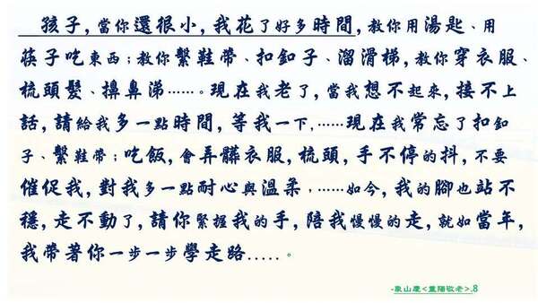 這是生命的必然,也是從生到死的過程,只是有快有慢、有淺有深。或許有人夭折猝死而未經自然老化的階段,但從無始劫來之無量生死之經歷,老衰乃是常態、累積的經歷,並不陌生。只有實相涅槃及往生極樂,才無老死、無量壽。這也是全人類、各國家的趨勢,因為營養好,科技高,既加速了老化,也延緩了老死,是幸或悲,有人不認老,美容拉皮,轉換跑道,或人工維生……..,「基因(遺傳工程)學」甚至預告人類可以不老不死。有云[20]:癌末絕症及重症病患有增無減。他們本應瓜熟蒂落、壽終正寢,卻仰賴「醫療、照護」體系,臥床度過餘年。壽命雖延長了,心靈卻不平靜。有些人久病厭生,徒增苦痛;對生死的恐懼、對未來的渺茫,不知何去何從。應運而生的「臨終關懷」以安慰、開導,解決了許多心中的疑惑。這其中,淨土宗最能切合末法五濁的需要。這是老人的實況:生老病死,人所必經;《修行本起經》云:「頭白齒落,皮緩面皺,肉消脊軁,支節萎曲,眼淚鼻涕,涎出相屬,上氣肩息,身色黧黑,頭手肬掉,軀體戰懾,惡露自出,坐臥其上。……年耆根熟,形變色衰,氣微力竭,食不消化,骨節欲離,坐起須人,目冥耳聾,便旋即忘,言輙悲哀,餘命無幾,故謂之老。……物生於春,秋冬悴枯,老至如電,身安足恃。」《瑜伽師地論》卷61描述老苦是「盛色、氣力、諸根、受用、壽量」的五相衰退;此外,由身心的衰退而強化了「病、死、愛別離、怨憎會、求不得、五蘊熾盛」的苦,更難以忍受,卻無力自救。曾在某護理之家牆上看到一幅字,年老的父母親對兒女們近乎懇求的告白:「孩子,當你還很小的時候,我花了好多時間,教你慢慢用湯匙、用筷子吃東西;教你繫鞋帶、扣釦子、溜滑梯,教你穿衣服、梳頭髮、擤鼻涕……。現在我老了,所以,當我想不起來,接不上話時,請給我多一點時間,等我一下,讓我再想一想;……現在我常忘了扣釦子、繫鞋帶;吃飯時,還會弄髒衣服,梳頭髮時手還會不停的颤抖.不要催促我,要對我多一點耐心和溫柔,……如今,我的腳也站不穩,走也走不動了,所以,請你緊緊的握著我的手,陪著我,慢慢的.就像當年一樣,我帶著你一步一步地學走。」這是老人最起碼的的需求,雖然很難如願;晚年的日子,多數的時間與精力用在看病、養身,已夠忙夠累了;只期盼外在環境能多一些友善、單純、安穩,以免於內外交瘁。為人父母者,養兒育女似乎理所當然,認命的付出一生的體力與愛心,到了老年,仍不願以衰殘的身心而拖累子女,雖然亟須子女的照料與陪伴,卻只能以一種害羞、抱歉的低語,乞求子女多一些耐煩、體諒,若真的給子女添了麻煩、增了負擔,就寧可獨居、去療養院,或早些去世…….。這樣謙卑奉獻的父母心,能換得多少兒女孝?因此,我們要有適當、妥善的對應;菩薩戒有兩面,消極的「不許」作(諸惡莫做),積極的「必須」作(眾善奉行)[21],消極、有所不為的自制,「己所不欲,勿施於人」,如「攝律儀戒」;老人的痛苦,我們雖然幫不上忙,至少不增加其負擔與憂煩;老人總有一些生平久慣而老來強化的習氣與性癖,讓我們感到不舒服或不認可,但業力使然,他們也身不自己,只能這樣;到了這種年紀,要求他們改進或配合,既難為,且殘忍。勿因其牴觸我們的原則或違犯我們的認知,就以我們的立場(見解)去批評、責備;須知,我輩「改變」較容易,他們幾乎不可能;反求諸己是本分,苛責他人乃霸凌。他們改不了、做不到的,就是夙昔的業障及今生的盲點,既應給他們寬容,也可讓我們借鑑:眾生皆如此,我也不例外。積極、有所作為的進取,「己欲立而立人,己欲達而達人」;如「攝善法戒」及「饒益有情戒」。對老人要由衷的「敬.安.養.愛.護.助.孝」,讓他們心有所「安.盼.喜.歸」,也就是給他們「親切.方便.溫暖.安穩.歡喜」,對他們「體恤.包容.服務.幫助.尊重.體貼」,具體表現於「說話和氣.態度和藹.噓寒問暖.親切招呼」…….。這麼多正向的身口意行為,我們不可能全部、滿分的做到,但這是一個方向、一種熏習,短期內「雖不能至」,但「心嚮往之」,隨分量力的做,做到幾分就是完成;或「見他人做」而能心隨喜、口讚嘆,身效法,互相勉勵與分享;重點或不在於現實上做到多少,而是形成一種善良、歡喜的環境(氛圍 Environmental atmosphere),讓老人在其中感受人間的溫情與安全,有助於生存的意願與心境的愉悅。