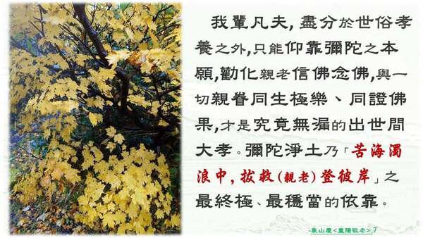 我輩凡夫,既無聖賢、孝子的德能,於世間之孝親、敬老必有缺漏;更無佛菩薩的大智大悲,於出世之孝、敬更難以奢望;除了盡分於世俗之孝養、承歡之外,只能仰靠阿彌陀佛之本願大力,勸化親老皈依三寶,信佛念佛,將來與一切親眷同生極樂、同證佛果,這才是究竟無漏的出世間大孝。彌陀淨土法門乃是「於苦海濁浪中,拔救親老登彼岸」之最終極、最穩當的依靠。南無阿彌陀佛