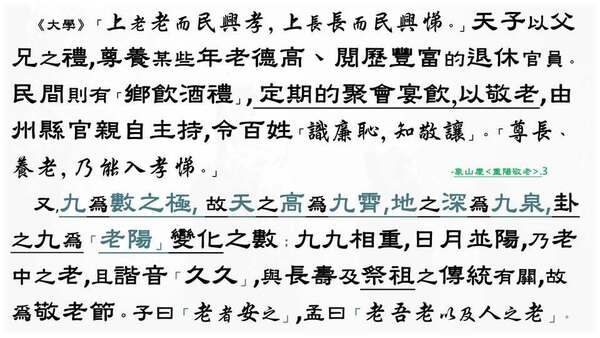 九為數之極,九以上歸零,故天之高為九霄,地之深為九泉,………。卦之九為「老陽」變化之數[4];九九相重,日月並陽,乃老中之老[5],且諧音「久久」,與長壽及祭祖、崇孝之傳統有關,故稱為敬老節。孔子曰「老者安之」,孟子曰「老吾老以及人之老」。又云:「伯夷辟紂,居北海之濱,聞文王作,興曰:盍歸乎來!吾聞西伯善養老者。」周文王行仁政、敬老尊賢,伯夷、叔齊、姜太公皆慕名來投。《禮記·祭義》:「昔者有虞氏貴德而尚齒,夏后氏貴爵而尚齒,殷人貴富而尚齒,周人貴親而尚齒。虞、夏、殷、周,天下之盛王也,未有遺年者。年之貴乎天下之久矣,次乎事親也。」《禮記·王制》:「五十養於鄉,六十養於國,七十養於學,達於諸侯。」「五十異粻,六十宿肉,七十二膳,八十常珍,九十飲食不離寢,膳飲從於游可也。」《續漢書·禮儀志》詳述了朝廷如何禮遇老人,如皇帝召見,允其行駛「馳道」旁道,並親為割肉、斟酒:「天子親袒割牲,執醬而饋,執爵而酳」;地方上老者可與官員平起平坐,逢年過節受賞賜及問候。梁武帝「孤獨園」、唐代「悲田院」,救助貧苦無依的老人。宋代設「福田院、居養院」。明清有「養濟院、飯廠、粥廠」等。[6]