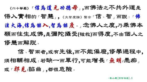 [2] 《涅槃經》卷36:「若人信心無有智慧,是人則能增長無明;若有智慧無有信心,是人則能增長邪見。」《大毘婆沙論》卷6:「無信之慧增長諂曲。……無慧之信增長愚癡。」《大智度論》亦云:「有信無智增長愚痴,有智無信增加邪見。」徹悟禪師<般若/淨土.兩門-大義>