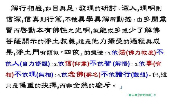 解行相應,如目與足:教理的研討、深入,理明則信深,信真則行篤,不被異學異解所動搖;由多聞熏習而啟動本有佛性之光明,就能或多或少了解佛菩薩開示的淨土教義,這一切也是他力攝受的過程與成果,淨土門有類似「四依」的提法:1.依法(佛力救度)不依人(自力修證);2.依信(仰靠)不依智 (解悟); 3.依事(有相)不依理(無相);4.依念佛(稱名)不依諸行(觀想)。但,這只是偏重的抉擇,而非全然的廢斥。
