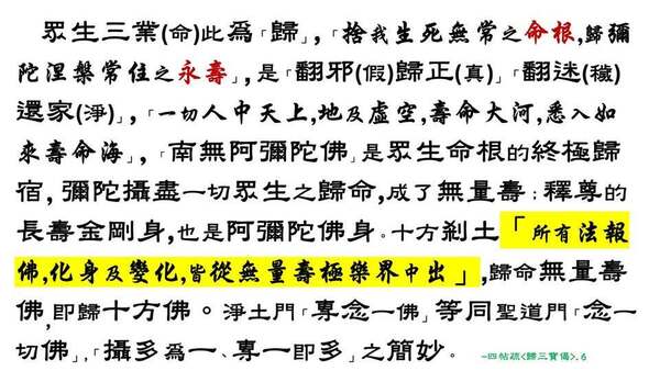 《疏》之始終,不外乎勸大眾「發願歸三寶」,而淨土門之三寶又不離乎「阿彌陀佛之名義功德」,無量光/壽是「法」、圓滿成就是「佛」、自信教人是「僧」,四字佛名總攝別相三寶。眾生的有漏三業(命)以此為「歸」,可說是「捨我生死無常之命根,歸彌陀涅槃常住之永壽」,此即「翻邪(假)歸正(真)」「翻迷(穢)還家(淨)」,究言之,「一切人中天上,地及虛空,壽命大河,悉入如來壽命海」[6],這是眾生「慧命」的終極歸宿,故稱「南無阿彌陀佛」,彌陀的「無量壽」,攝盡了一切眾生的歸命;乃至釋尊的「長壽金剛身」,也是阿彌陀法身;而十方剎土的「所有法報佛,化身及變化,皆從無量壽極樂界中出」[7],因此,歸命「無量壽」佛,即是歸命十方諸佛。這是淨土門「專念一佛」等同聖道門「念一切佛」,「攝多為一、專一即多」之雖簡而妙。由此也可了知「聖、淨」二門的差別。