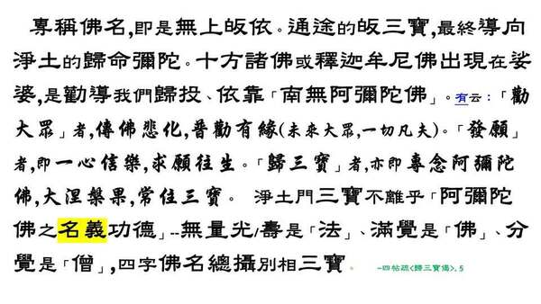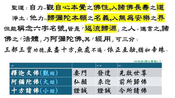 淨土三經分別配以「釋尊.彌陀.諸佛」三主,及「發遣.來迎.證誠」三寶,可以說,歸依「阿彌陀佛」及「淨土三經」,即等於歸依「通途」一切三寶也。